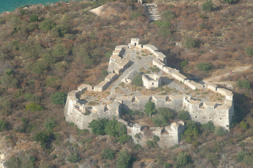 The castle would have been vulnerable to cannon fire from the hill above and this also suggests an early date for its construction when cannon had not developed the range they had later. In 1662 the Venetians feared the Turks would recondition it. In 1803 Ali Pasha offered the castle and port to the Royal Navy. At which time the fort only had 4 or 5 cannon implying that Ali Pasha did not see the fort as important for him. Leake visited the fort and noted that the garrison consisted of 10 men with two four-pounders. Pouqueville in 1806 reports, "The tower or fort stands on the southern point of the entrance, connected with the continent by a low narrow isthmus. It consists of a square with bastions, having a few guns, of no service either to command the entrance or to protect the shipping at anchor. Near it are some warehouses, a custom-house, and a Greek church."