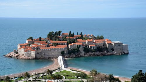 Defensive tower on Sveti Stefan islet and hotel resort in Montenegro, approximately 6 kilometres (3.7 mi) southeast of Budva.