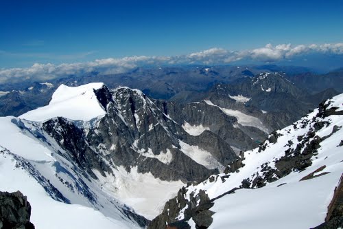 Belukha is a three-peaked mountain massif that rises along the border of Russia and Kazakhstan, just a few tens of miles north of the point where this border meets with the border of China. There are several small glaciers on the mountain, including Belukha Glacier. Of the two peaks, the eastern peak (4,506 m, 14,784 ft.) is higher than the western peak (4,440 m, 14,567 ft.).