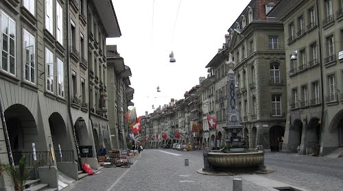 The Old City of Bern is the medieval city center of Bern, Switzerland. Built on a narrow hill surrounded on three sides by the Aare River, its compact layout has remained essentially unchanged since its construction during the 12th to the 15th century. Despite a major fire in 1405, after which much of the city was rebuilt in sandstone, and substantial construction efforts in the 18th century, Bern's old city has retained its medieval character.