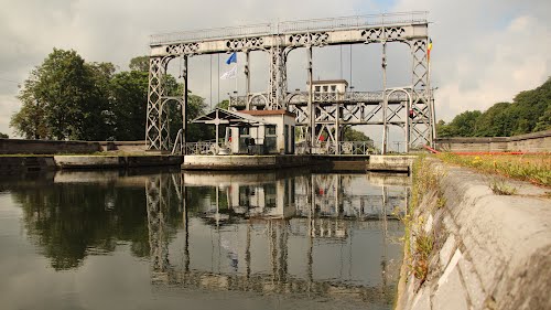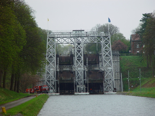 The lifts on the old Canal du Centre are a series of four hydraulic boat lifts near the town of La Louviere in the Sillon industriel of Wallonia, classified both as Wallonia's Major Heritage and as a World Heritage Site (province of Hainaut). Along a particular 7 km (4.3 mi) stretch of the Canal du Centre, which connects the river basins of the Meuse and the Scheldt, the water level rises by 66.2 metres (217 ft). To overcome this difference, the 15.4-metre lift at Houdeng-Goegnies was opened in 1888, and the other three lifts, each with a 16.93 metres (55.5 ft) rise, opened in 1917.